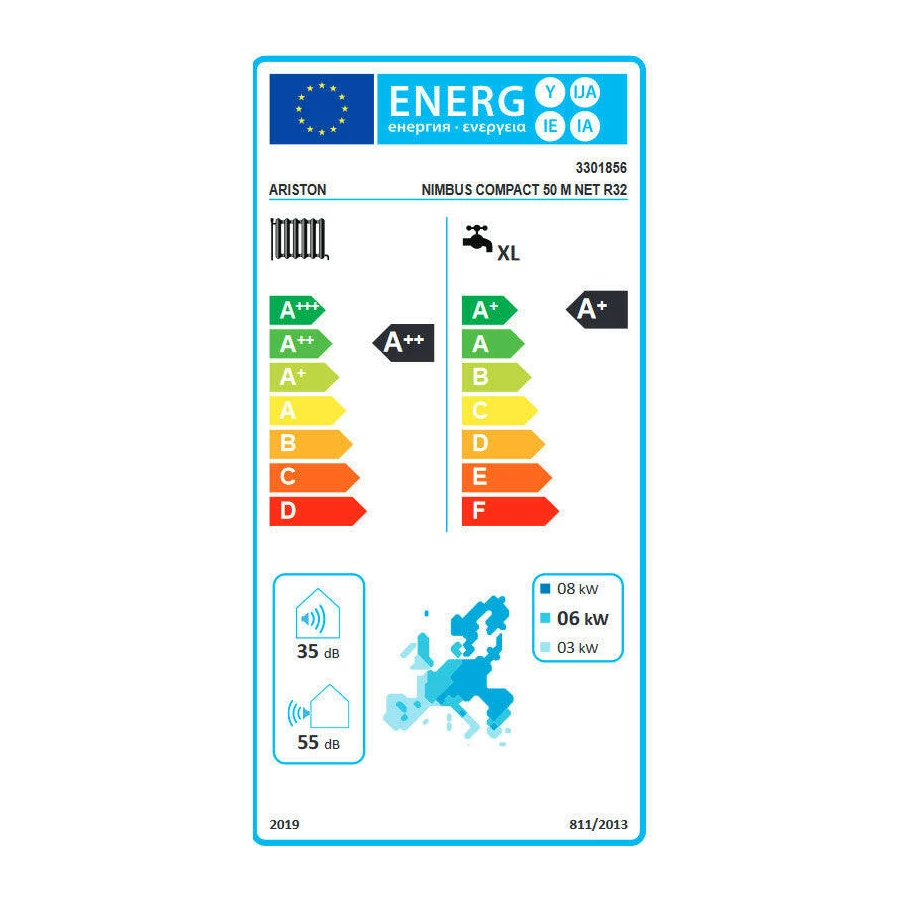 - Fűtési energiahatékonysági besorolás (35 °C): A+++